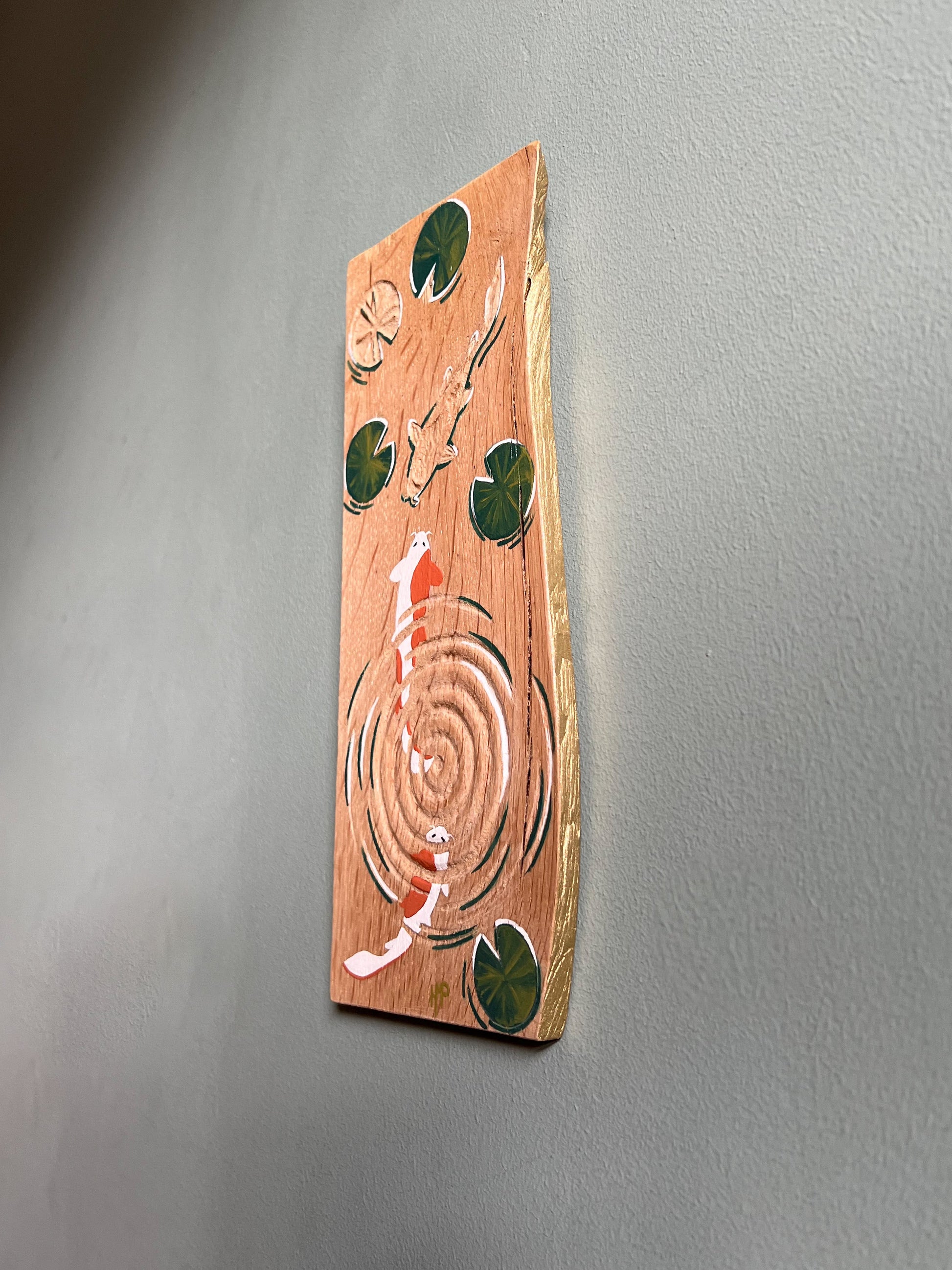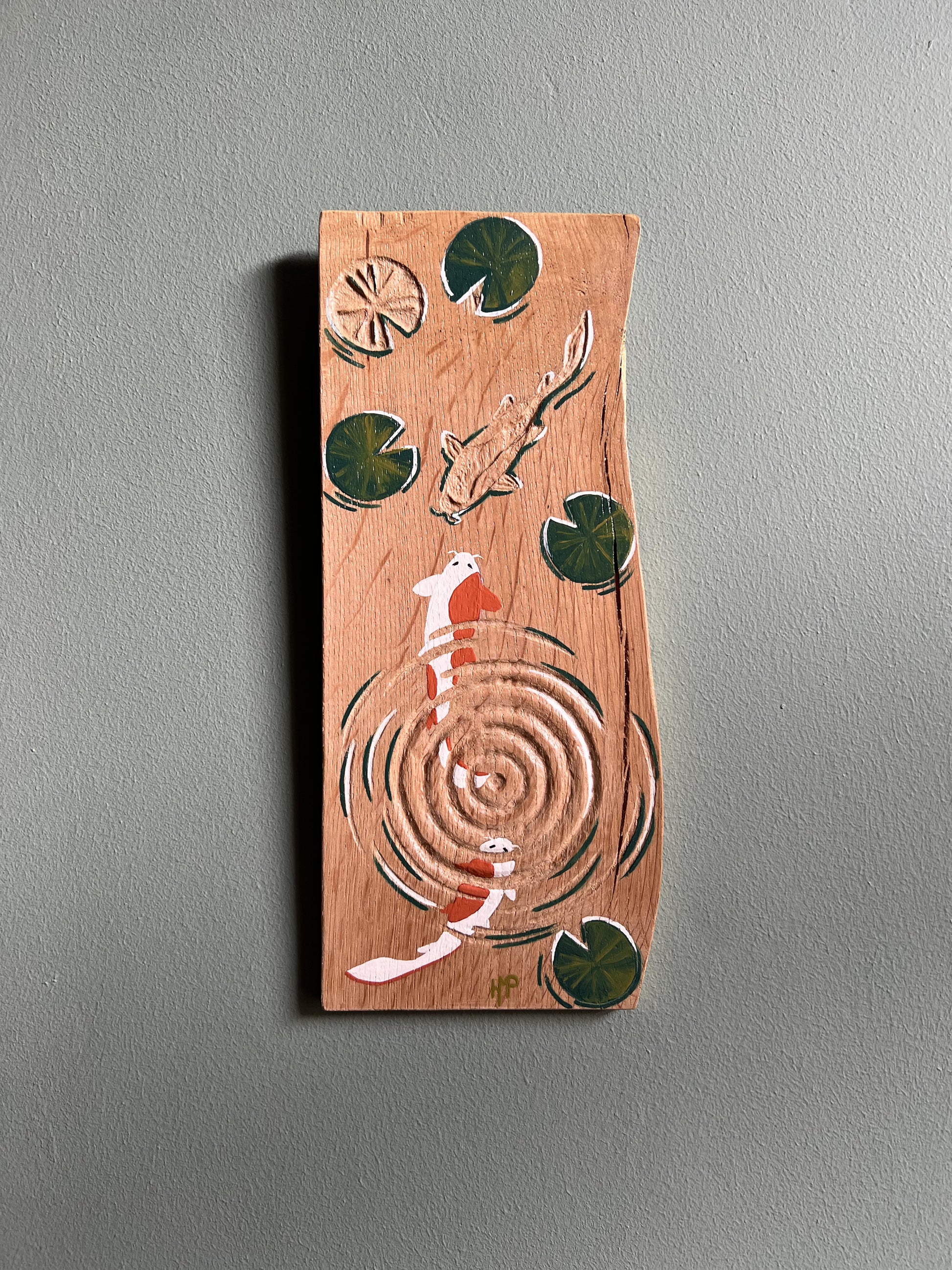 Planche de bois gravée et peinte à la main, motifs carpes koï et nénuphars.