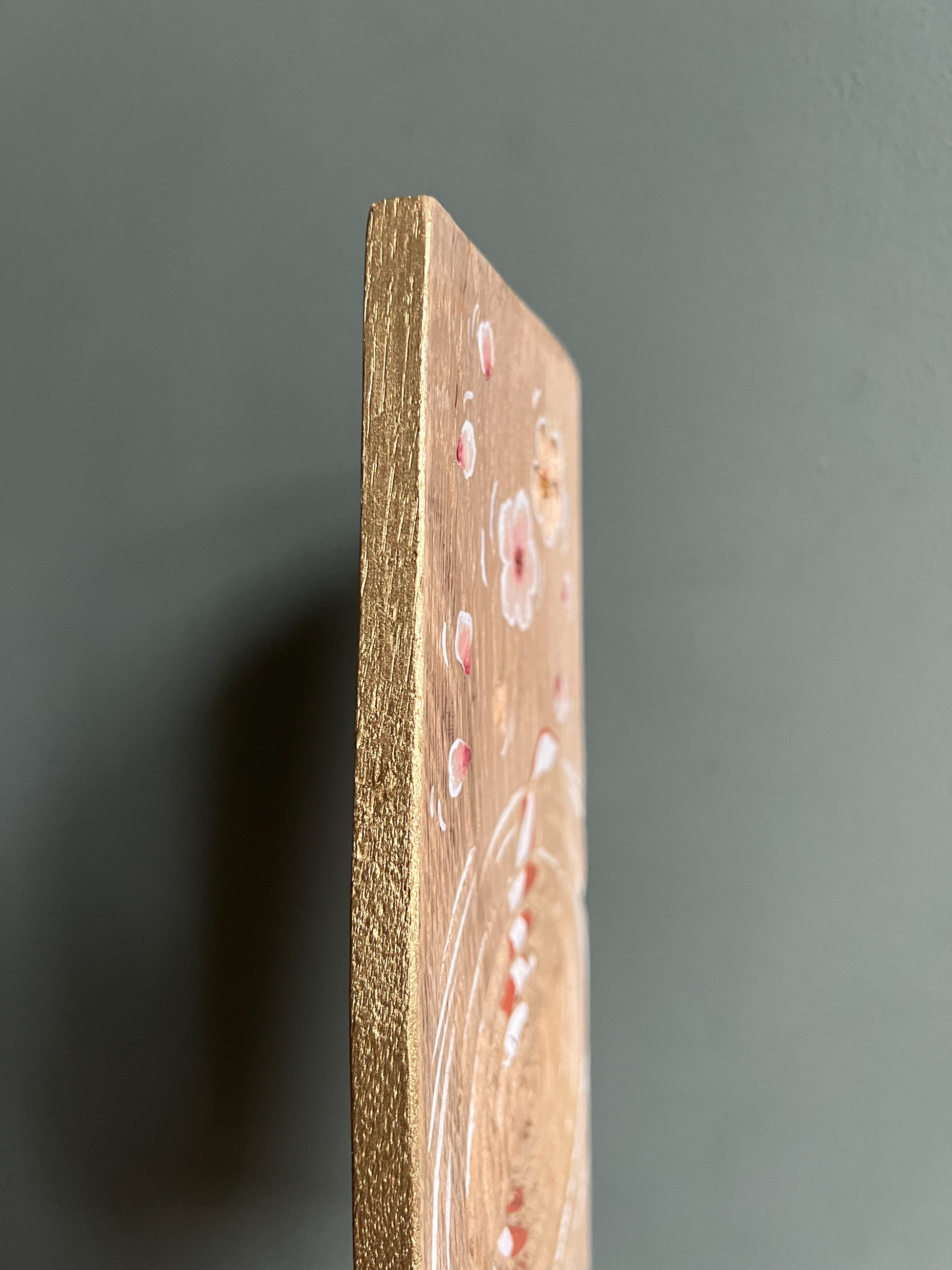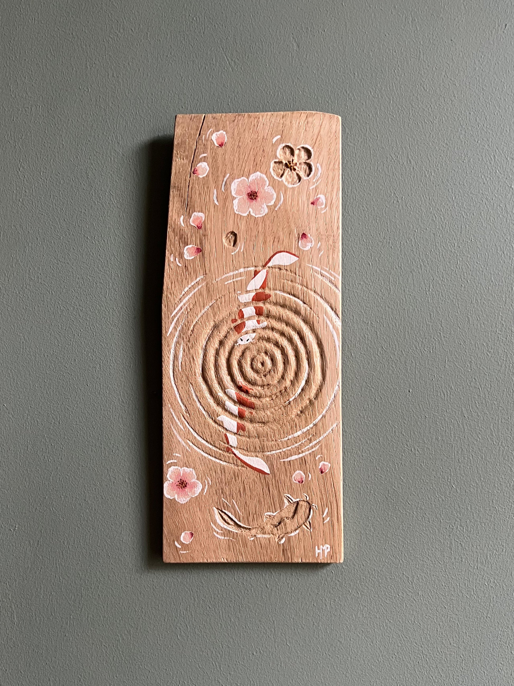 Planche de bois gravée et peinte à la main, motifs Sakura et Carpes Koï.