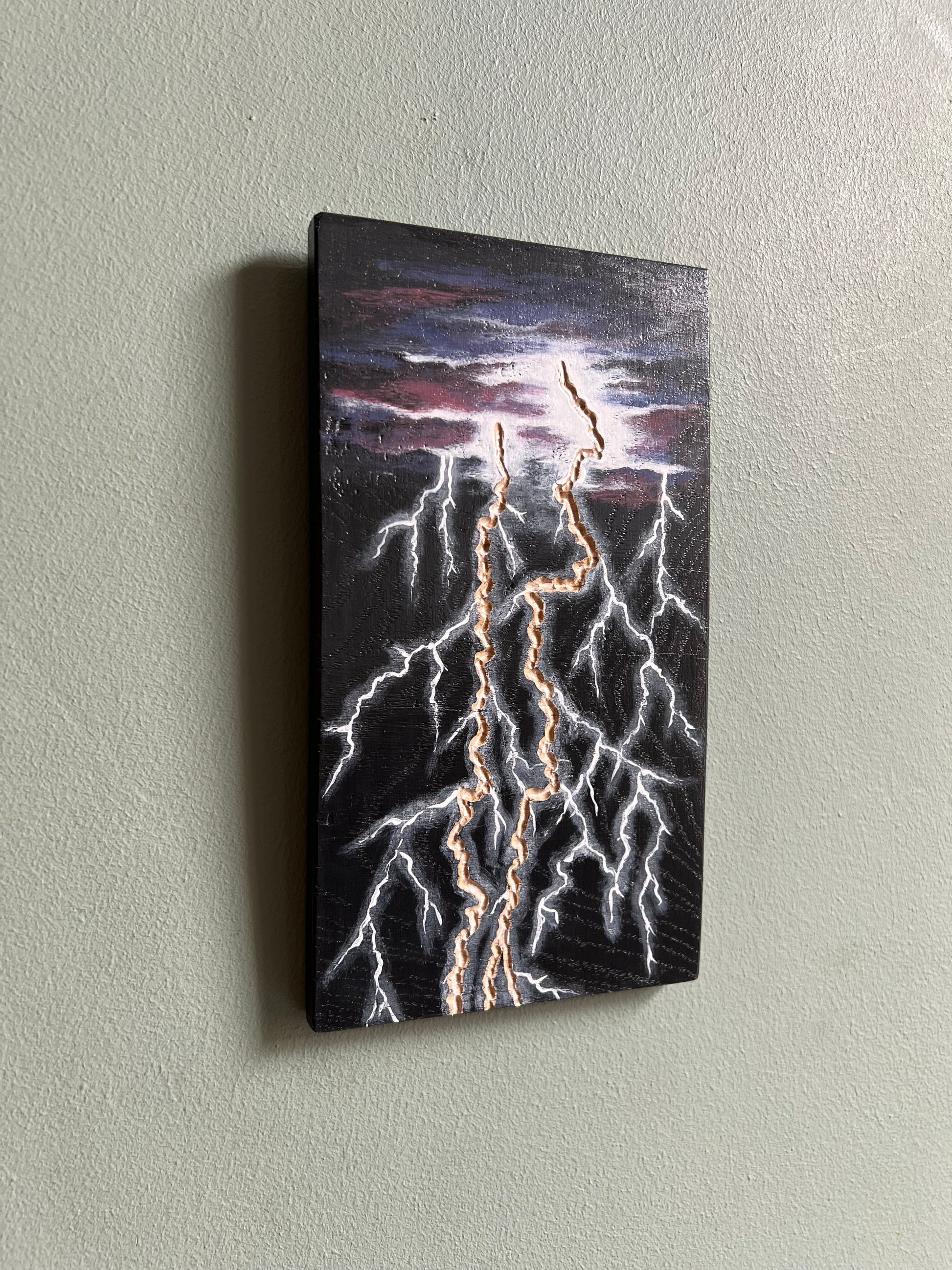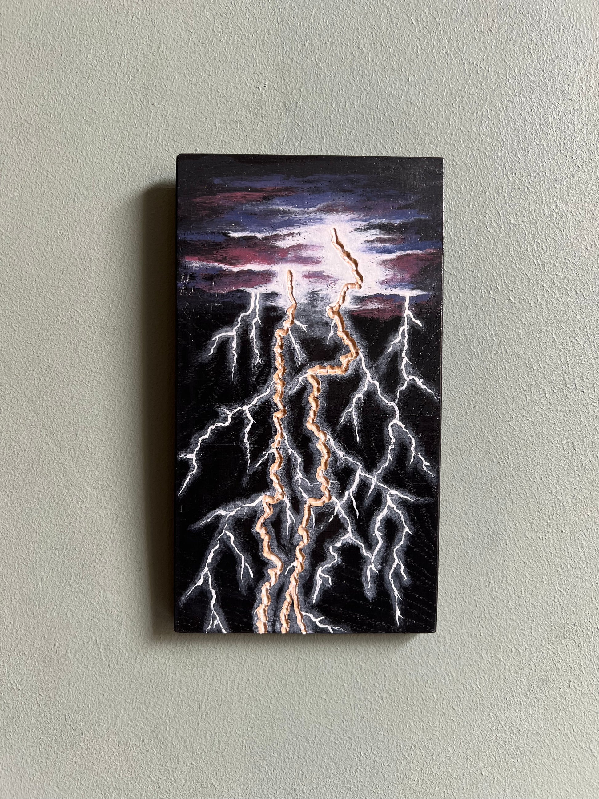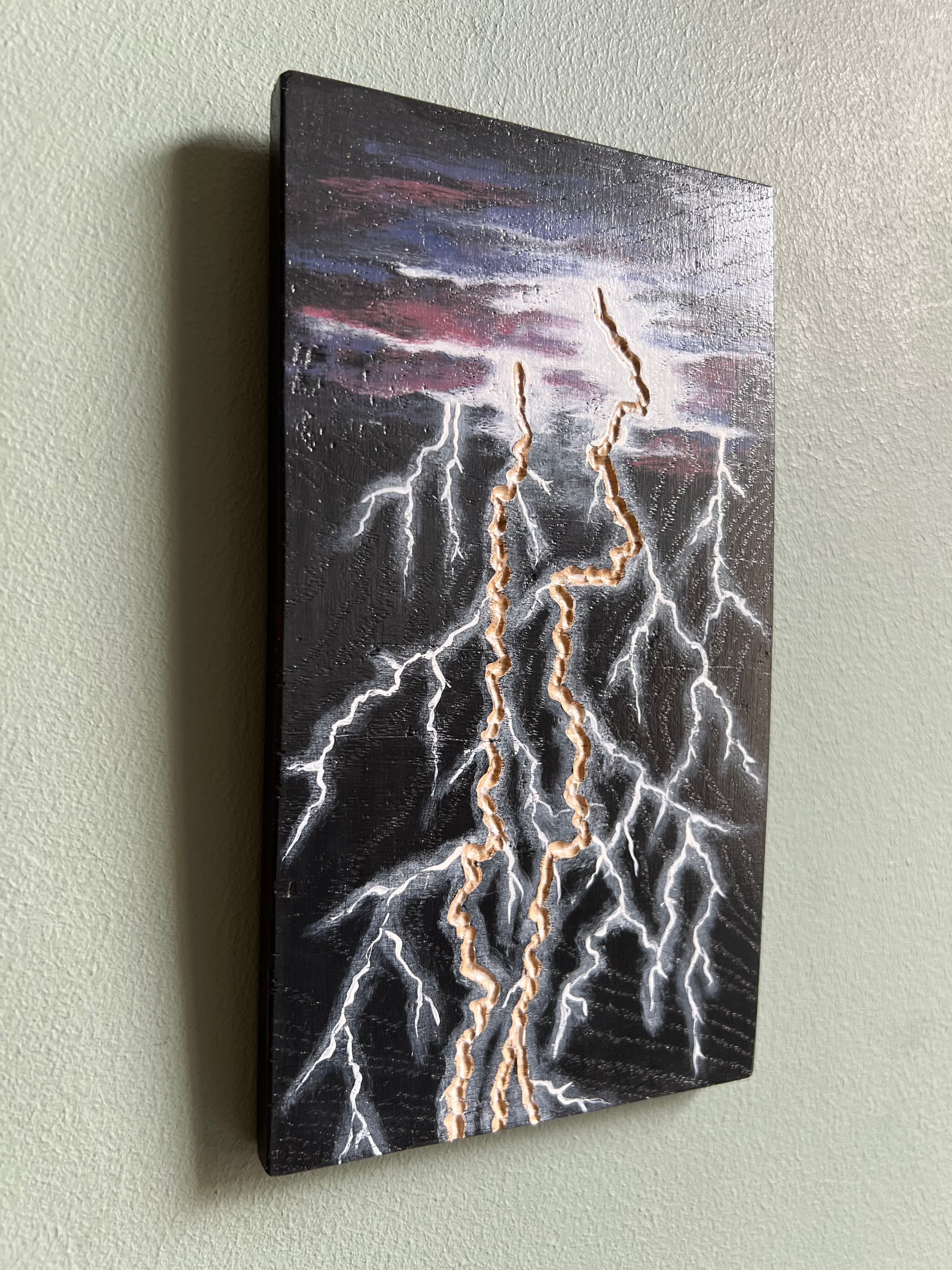 Planche de bois gravée et peinte à la main, motif éclairs.