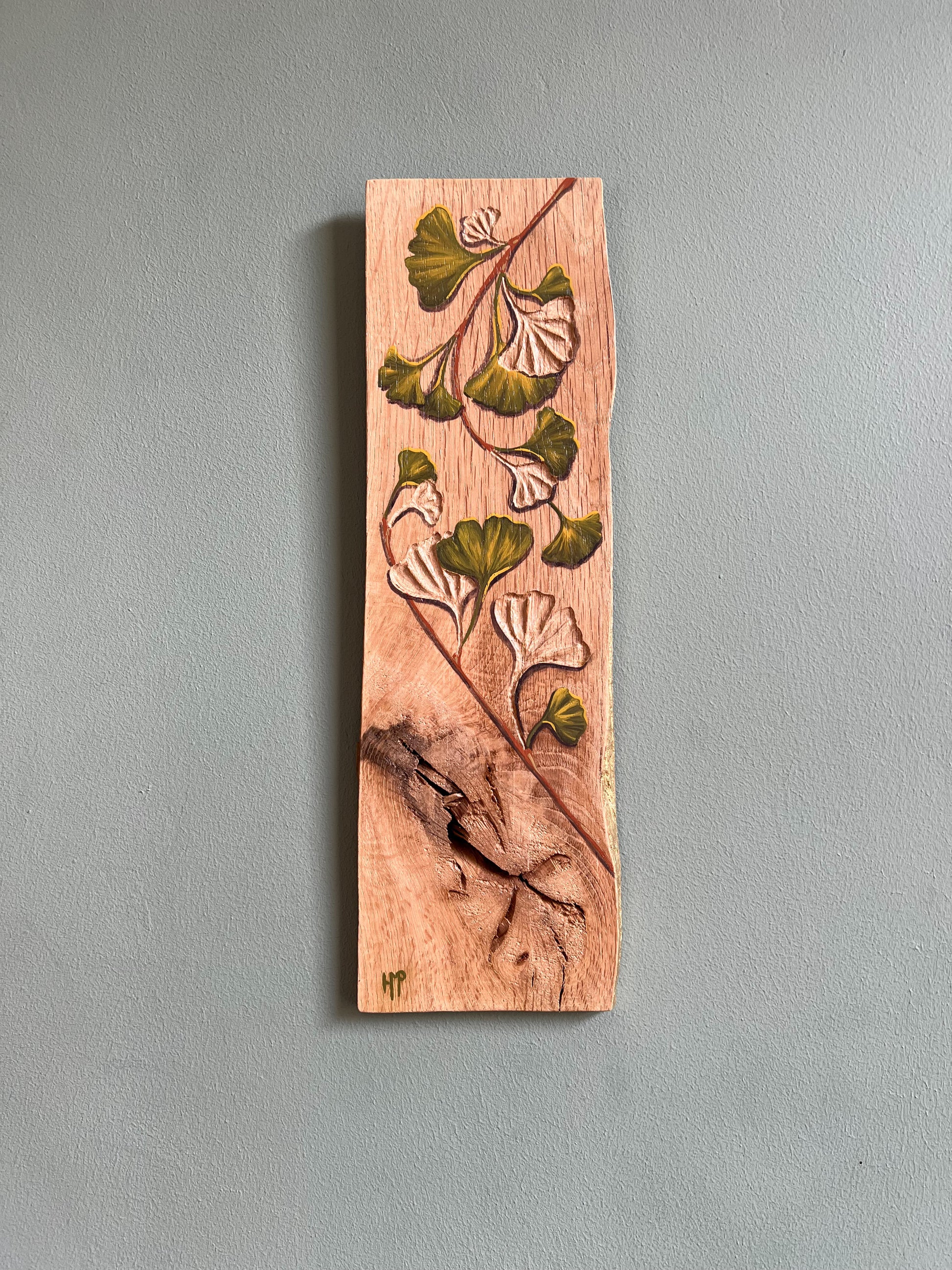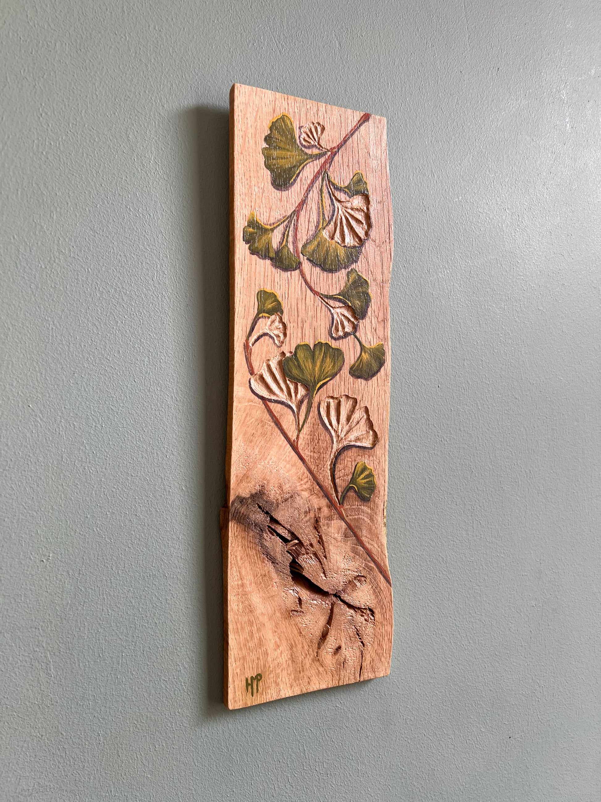 Planche de bois gravée et peinte à la main, motif gingko biloba.