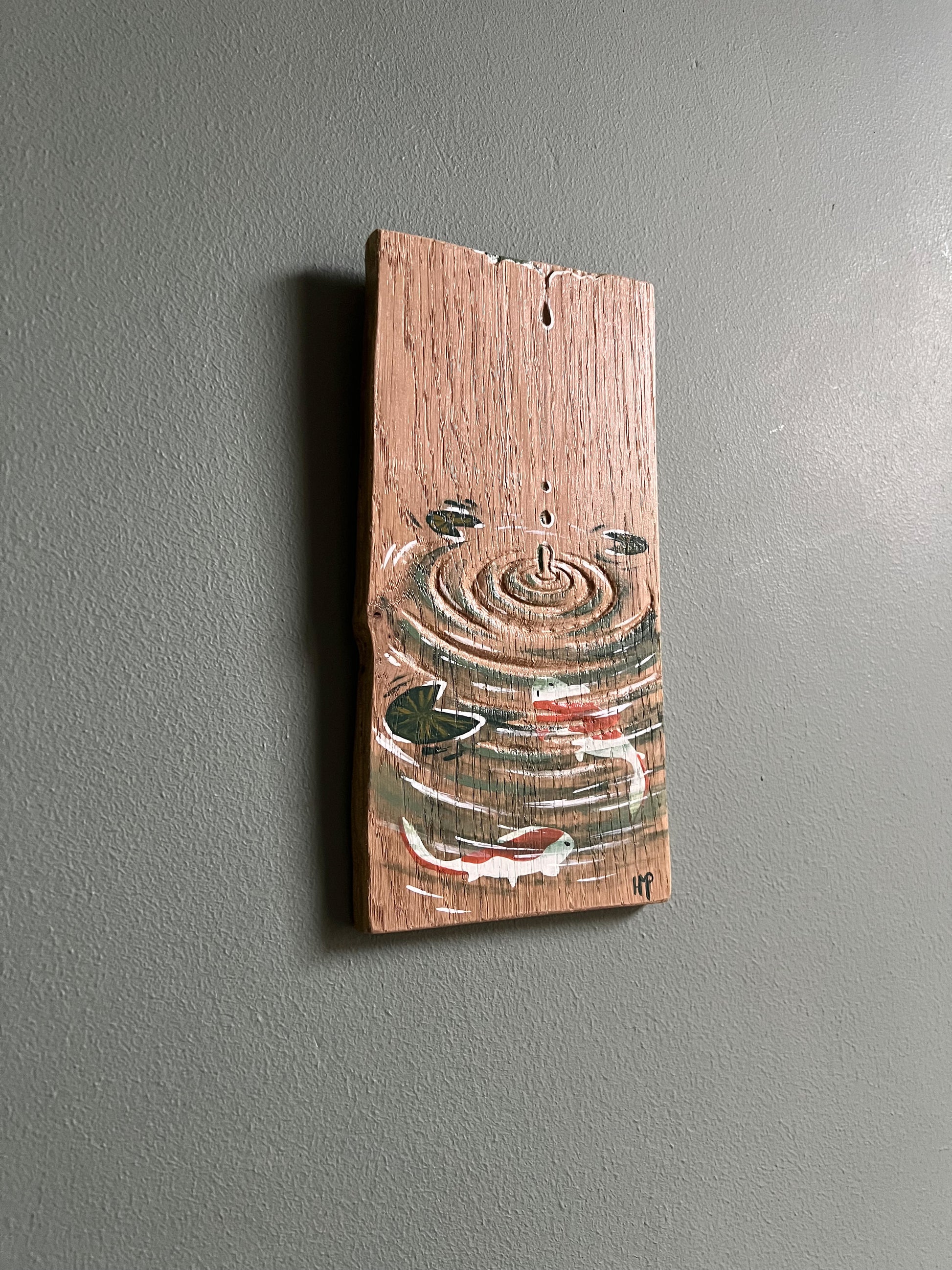 Planche de bois gravée et peinte à la main, motifs Carpes Koï et goutte d’eau.