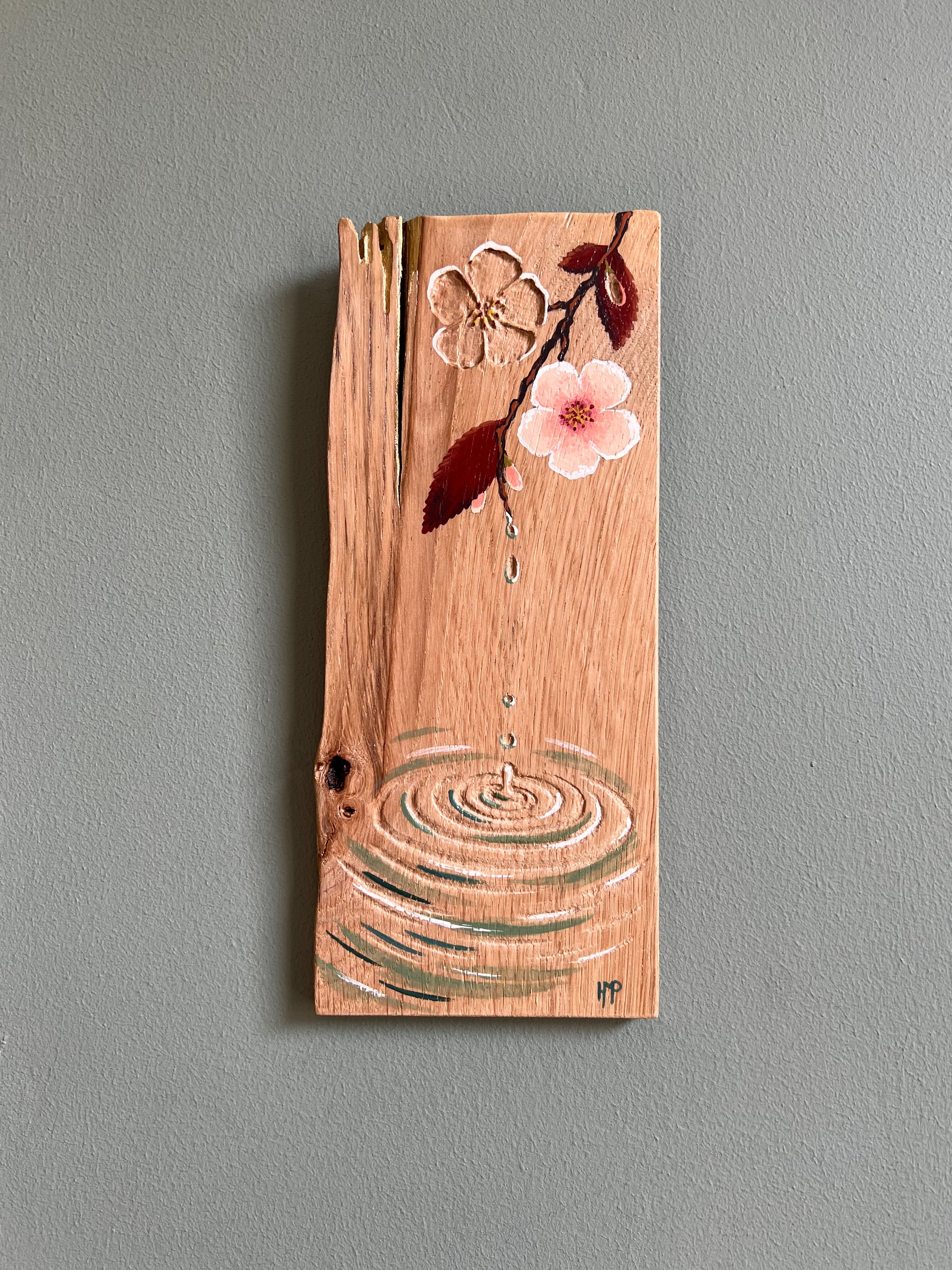 Planche de bois gravée et peinte à la main, motifs Sakura et goutte d’eau.