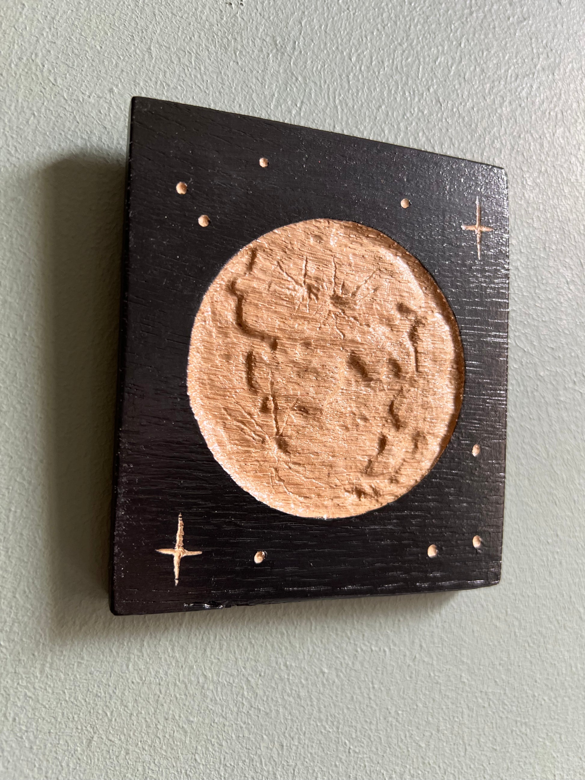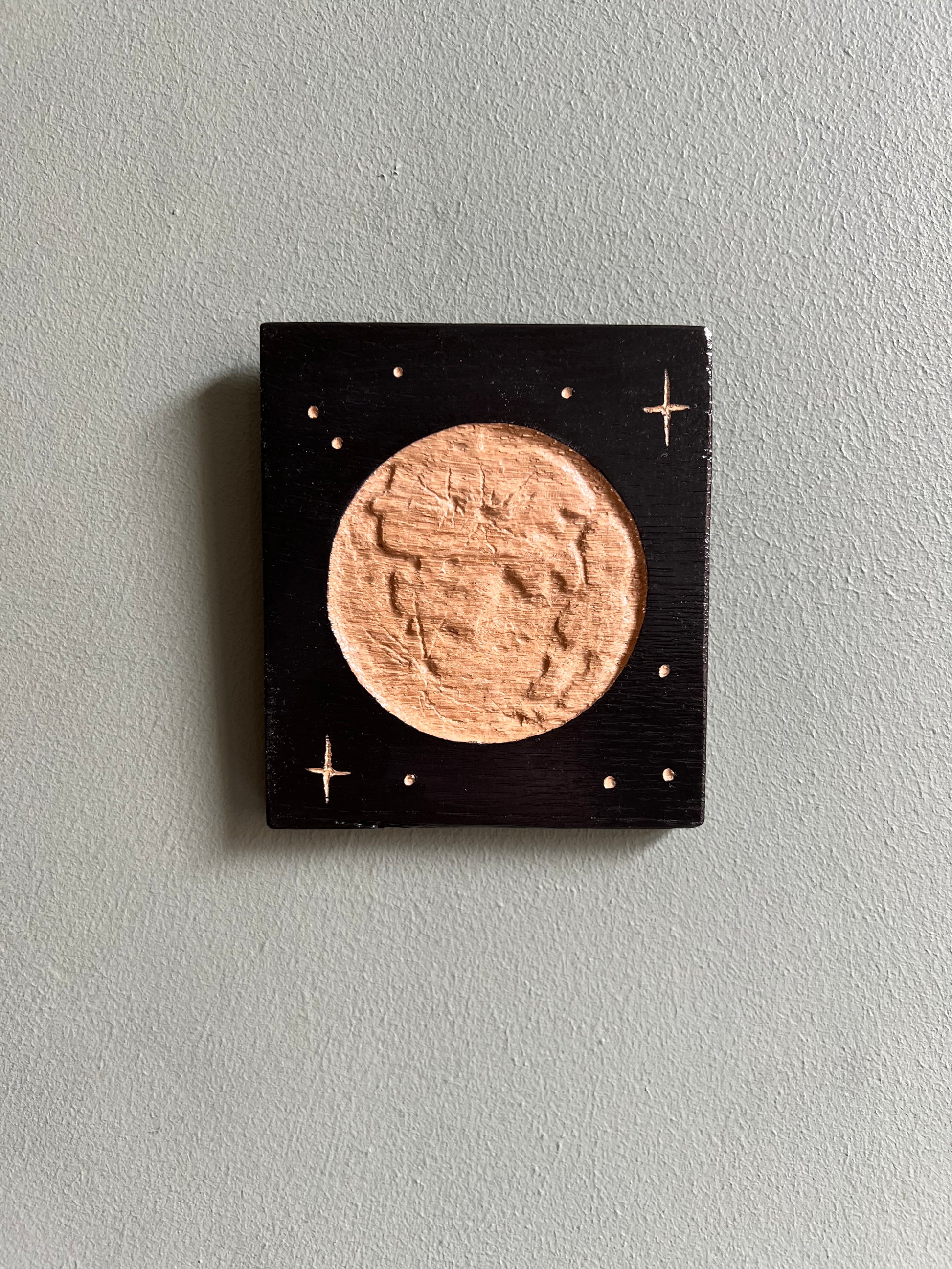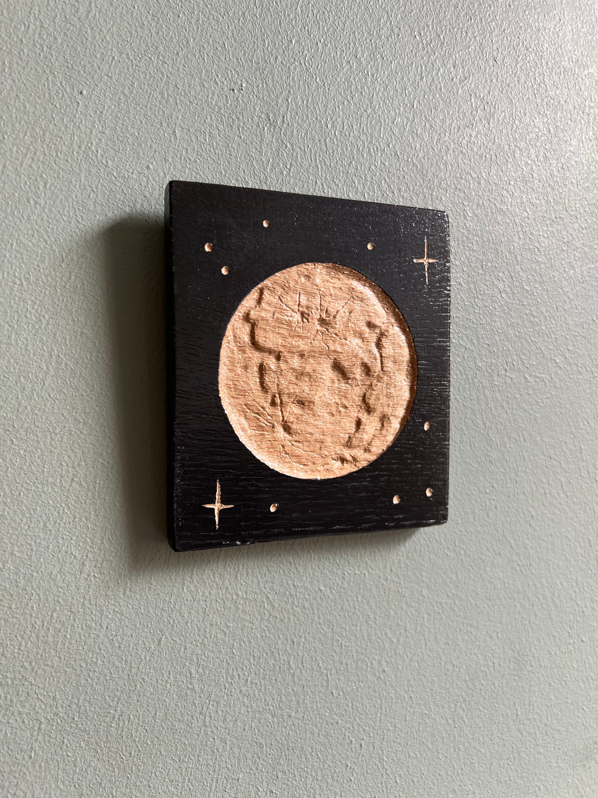 Planche de bois gravée et peinte à la main, motif lune. Incrustation en loupe d’orme