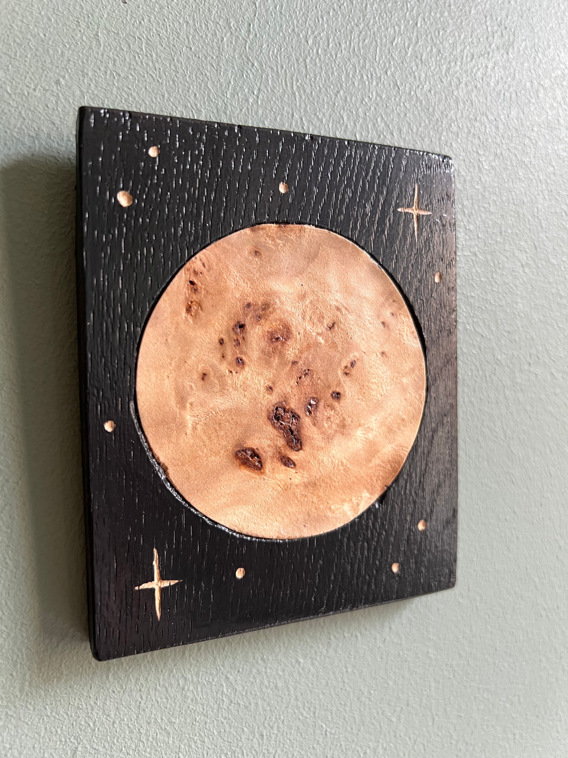 Planche de bois gravée et peinte à la main, motif lune. Incrustation en loupe d’orme
